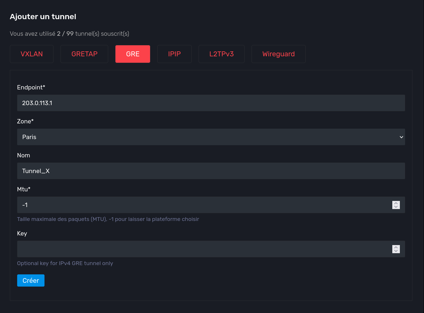 Tunnel-IP n’est pas limité à un seul protocole ; la plateforme permet de créer des tunnels L2 (bridging / VLANs) et L3, et elle supporte plusieurs technologies (GRE, IPIP, WireGuard, VXLAN). Cette diversité est importante : elle permet d’adapter la solution aux contraintes réseau et aux équipements des clients.